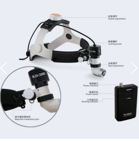 This style (KD-205AY-1) is high quality surgical light, the light spots can be adjustable and the brightness is adjustable, lighting angle are adjustable widely. CKD-205AY-1 is edge-to-edge clarity, pure white beam to aid in dental color matching techniques, and hands-free operation, let you focus on your procedures, and allows you to go from patient to patient, without being tied down. using the rechargeable lithium battery, congevity of service and the more comfortable lightweight headlights, it is suitable for all kinds of surgical operation